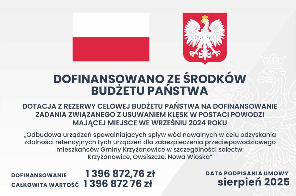 Odbudowa urządzeń spowalniających spływ wód nawalnych w celu odzyskania zdolności retencyjnej tych urządzeń dla zabezpieczenia przeciwpowodziowego mieszkańców Gminy Krzyżanowice w szczególności sołectw: Krzyżanowice, Owsiszcze, Nowa Wioska Dotacja z rezerwy celowej budżetu państwa na dofinansowanie zadania związanego z usuwaniem skutków klęski w postaci powodzi mającej miejsce we wrześniu 2024 roku. Dofinansowanie: 1 396 872,76 zł Wartość zadania: 1 396 872,76 zł Część I – (ID 1686) „Odbudowa rowu na działkach nr 429, 408, 409 w Krzyżanowicach”; Zakres zadania: wykonania jest odtworzenie skarp – skarpa wzdłuż drogi oraz skarpa przy przepuście na rowie w tym m. in.: przywóz mieszanki do stabilizacji gruntów, przewóz materiałów budowlanych, formowanie i zagęszczanie nasypów posadawianych, skarpowanie brzegów rzek, kanałów i rowów, wzmacnianie powierzchni skarp, humusowanie skarp z obsianiem, ręczne wykoszenie porostów ze skarp rowów, koron i skarp nasypów, ręczne usuwanie namułu z cieków, oczyszczenie z namułu przepustów rurowych, rozebranie nawierzchni z płyt ażurowych, umocnienie skarp i dna prefabrykowanymi płytami ażurowymi, Część II – (ID 1933)” „Odbudowa rowu na działkach nr 1177/3, 15, 19 w Krzyżanowicach; Zakres zadania obejmuje m.in.: ręczne wykoszenie porostów ze skarp rowów, koron i skarp nasypów, usuwanie namułu, oczyszczenie z namułu przepustów rurowych, wywóz namułu z odmulenia rowu, remont i cząstkowe umocnienie skarp i dna prefabrykowanymi płytami betonowymi, remont i cząstkowe umocnienie skarp i dna prefabrykowanymi płytami ażurowymi. Część III – (ID 2442) „Odbudowa rowu na działce nr 5 w Nowej Wiosce”; Zakres zadania obejmuje m.in.: ręczne wykoszenie porostów ze skarp rowów, koron i skarp nasypów, usuwanie namułu, oczyszczenie z namułu przepustów rurowych, wywóz namułu z odmulenia rowu. Część IV – (ID 2306) „Odbudowa rowu na działce nr 430 w Krzyżanowicach”; Zakres zadania obejmuje m.in.: cięcie piłą nawierzchni bitumicznych, mechaniczne rozbieranie nawierzchni z mieszanek mineralno-bitumicznych, wywóz nawierzchni bitumicznej, przewóz materiałów budowlanych, utylizacja nawierzchni bitumicznej, roboty pomiarowe przy liniowych robotach ziemnych, mechaniczne profilowanie i zagęszczenie podłoża, podbudowa z kruszywa łamanego warstwa dolna i górna, skropienie nawierzchni drogowej asfaltem, nawierzchnia z mieszanek mineralno-bitumicznych. Część V –(ID 1704) „Odbudowa rowu na działkach nr 314, 316, 315/1 w Owsiszczach”. Zakres zadania obejmuje m.in.: Odmulenie stawów, odbudowa grobli ziemnych, odbudowa jazów oraz odbudowa mnichów: ręczne wykoszenie porostów ze skarp rowów, koron i skarp nasypów, odmulenie stawów z transportem urobku, przywóz gliny, przewóz materiałów budowlanych, formowanie i zagęszczanie nasypów posadawianych, elementy żelbetowe, zbrojenie konstrukcji betonowych, zastawy stalowe.