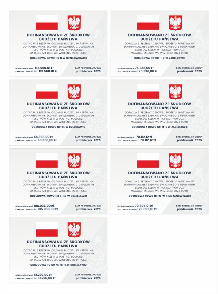 Odbudowa rowu nr 11 w Bieńkowicach Dotacja z rezerwy celowej budżetu państwa na dofinansowanie zadania związanego z usuwaniem skutków klęski w postaci powodzi mającej miejsce we wrześniu 2024 roku. Dofinansowanie: 113.560,01 zł Wartość zadania: 113.560,01 zł Zakres zadania obejmuje m. in.: wykoszenie ręczne porostów gęstych twardych ze skarp, oczyszczenie z namułu przepustów rurowych, odmulenie cieków, oczyszczanie rowu z namułu z wyprofilowaniem skarpy rowu, umocnienie skarpy i dna rowu płytami chodnikowymi. Odbudowa rowu nr 24 w Bolesławiu Dotacja z rezerwy celowej budżetu państwa na dofinansowanie zadania związanego z usuwaniem skutków klęski w postaci powodzi mającej miejsce we wrześniu 2024 roku. Dofinansowanie: 58.368,00 zł Wartość zadania: 58.368,00 zł Zakres zadania obejmuje m.in.: wykoszenie ręczne porostów gęstych twardych ze skarp, oczyszczenie z namułu przepustów rurowych, odmulenie cieków, oczyszczanie rowu z namułu z wyprofilowaniem skarpy rowu, umocnienie skarpy i dna rowu płytami chodnikowymi. Odbudowa rowu nr B-40 w Bolesławiu Dotacja z rezerwy celowej budżetu państwa na dofinansowanie zadania związanego z usuwaniem skutków klęski w postaci powodzi mającej miejsce we wrześniu 2024 roku. Dofinansowanie: 105.036,00 zł Wartość zadania: 105.036,00 zł Zakres zadania obejmuje m.in.: wykoszenie ręczne porostów gęstych twardych ze skarp, oczyszczenie z namułu przepustów rurowych, odmulenie cieków, oczyszczanie rowu z namułu z wyprofilowaniem skarpy rowu, umocnienie skarpy i dna rowu płytami chodnikowymi. Odbudowa rowu nr 18, 19 w Bolesławiu Dotacja z rezerwy celowej budżetu państwa na dofinansowanie zadania związanego z usuwaniem skutków klęski w postaci powodzi mającej miejsce we wrześniu 2024 roku. Dofinansowanie: 81.220,00 zł Wartość zadania: 81.220,00 zł Zakres zadania obejmuje m.in.: wykoszenie ręczne porostów gęstych twardych ze skarp, oczyszczenie z namułu przepustów rurowych, odmulenie cieków, oczyszczanie rowu z namułu z wyprofilowaniem skarpy rowu, umocnienie skarpy i dna rowu płytami chodnikowymi. Odbudowa rowu nr H-3 w Zabełkowie Dotacja z rezerwy celowej budżetu państwa na dofinansowanie zadania związanego z usuwaniem skutków klęski w postaci powodzi mającej miejsce we wrześniu 2024 roku. Dofinansowanie: 75.338,00 zł Wartość zadania: 75.338,00 zł Zakres zadania obejmuje m.in.: wykoszenie ręczne porostów gęstych twardych ze skarp, mechaniczne karczowanie średnio gęstych zagajników, oczyszczenie z namułu przepustów rurowych, odmulenie cieków, oczyszczanie rowu z namułu z wyprofilowaniem skarpy rowu, umocnienie skarpy i dna rowu płytami chodnikowymi. Odbudowa rowu nr H-5 w Zabełkowie Dotacja z rezerwy celowej budżetu państwa na dofinansowanie zadania związanego z usuwaniem skutków klęski w postaci powodzi mającej miejsce we wrześniu 2024 roku. Dofinansowanie: 70.112,12 zł Wartość zadania: 70.112,12 zł Zakres zadania obejmuje m.in.: wykoszenie ręczne porostów gęstych twardych ze skarp, mechaniczne karczowanie średnio gęstych zagajników, oczyszczenie z namułu przepustów rurowych, mechaniczne karczowanie drzew, odmulenie cieków, oczyszczanie rowu z namułu z wyprofilowaniem skarpy rowu, umocnienie skarpy i dna rowu płytami chodnikowymi. Odbudowa rowu nr 26 w Krzyżanowicach Dotacja z rezerwy celowej budżetu państwa na dofinansowanie zadania związanego z usuwaniem skutków klęski w postaci powodzi mającej miejsce we wrześniu 2024 roku. Dofinansowanie: 70.695,01 zł Wartość zadania: 70.695,01 zł Zakres zadania obejmuje m.in.: wykoszenie ręczne porostów gęstych twardych ze skarp, mechaniczne karczowanie średnio gęstych zagajników, oczyszczenie z namułu przepustów rurowych, mechaniczne karczowanie drzew, odmulenie cieków, oczyszczanie rowu z namułu z wyprofilowaniem skarpy rowu, umocnienie skarpy i dna rowu płytami chodnikowymi. Odbudowa rowu nr 31 w Krzyżanowicach Dotacja z rezerwy celowej budżetu państwa na dofinansowanie zadania związanego z usuwaniem skutków klęski w postaci powodzi mającej miejsce we wrześniu 2024 roku. Dofinansowanie: 46.988,41 zł Wartość zadania: 46.988,41 zł Zakres zadania obejmuje m.in.: wykoszenie ręczne porostów gęstych twardych ze skarp, mechaniczne karczowanie średnio gęstych zagajników, oczyszczenie z namułu przepustów rurowych, odmulenie cieków, oczyszczanie rowu z namułu z wyprofilowaniem skarpy rowu, umocnienie skarpy i dna rowu płytami chodnikowymi.