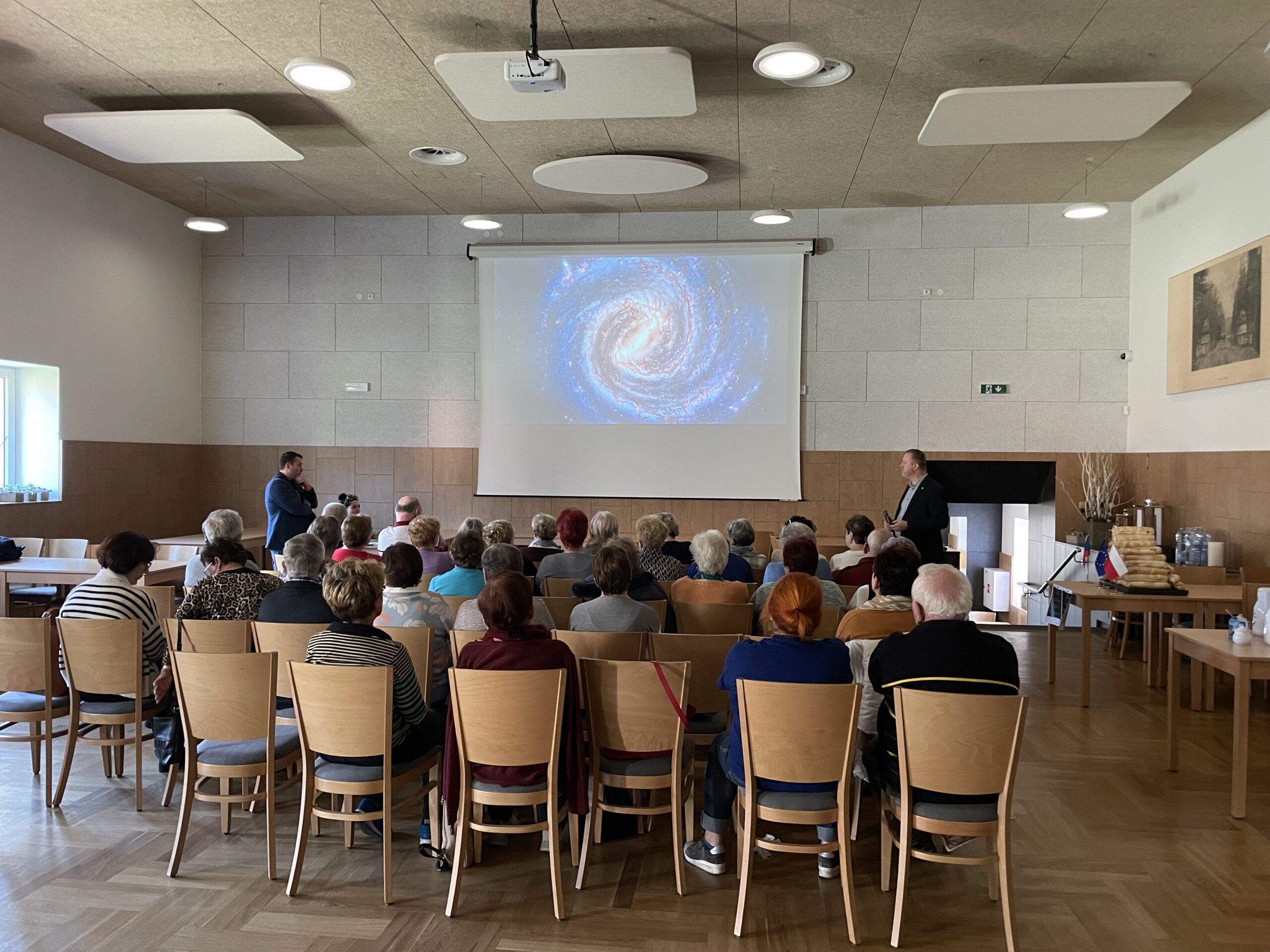 Powrót do listy wiadomości Opublikowano: 21.03.2025 Astropogranicze w Šilheřovicach W ramach projektu Astro-pogranicze seniorki i seniorzy Klubu Seniora Gminy Krzyżanowice oraz partnerskiej gminy Šilheřovice wzięli udział w warsztatach o gwiazdach i gwiazdozbiorach na polsko-czeskim pograniczu. Warsztaty odbyły się 20 marca 2025 r. w Domu Kultury w Šilheřovicach. Podczas warsztatów seniorzy i seniorki poznali działanie teleskopu, obserwowali obiekty astronomiczne, uczyli się rozpoznawać gwiazdozbiory przy użyciu aplikacji na smartfony Stellarium czy Sky Map. Na zakończenie warsztatów uczestnicy za pomocą rysików tworzyli własne autorskie gwiazdozbiory na czarnych kartkach do zdrapywania. Warsztaty prowadzili p. Dawid Barteczko i Michał Witek z AstroLab, a skuteczną komunikację pomiędzy uczestnikami z Czech a prowadzącymi umożliwiła obecność tłumaczki p. Anny Niestroj. Warsztaty zorganizowano w projekcie „Astro-Pogranicze” w ramach FMP w Euroregionie Silesia – Programu Interreg Czechy – Polska 2021-2027. Środki na realizację w/w projektu pozyskała Gmina Krzyżanowice. Galeria zdjęć (6) Zdjęcie 1 z 6